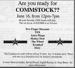 6/16/00- We also have a show at the Neutral Zone tonight at 6pm. The cover is five bucks. 5/27/00- So we lied, Mike just couldn't stand the temptation of another gig. This one is at Mr. Mug's Hideout in ypsi. It's located on 217/211 Michigan ave. by the buss station and Deja Vu. The Thrones, Brick, and Folie are gonna be there as well. The show starts at 7:30, and there's five bucks cover. As always there will be plenty of free pop, and we should have some stickers to give out to our loyal fans that come all the way to ypsi to see us. 4/15/00- CHEAP THREE DOLLARS!!! We just made this one official! After five months and many unseen revisions of the band we are back. This is going to be the best gig the Neutral Zone has ever had. We will be playing with Deity, an anonymous band, and undecided. The show starts at 8pm, and there is a three dollar cover. That's right, we're not gonna try and rip you off like every one else does! Neutral zone members (aka: dorks) only pay two bucks. There will be double the free soda and double the hype! This will hopefully be 5 Finger Discounts last gig at the Neutral Zone for a while. And yes, we do plan on playing other places (we're not that lame). 11/5/99- This flyer is the flyer of our first Commstock Fundraiser. Whoop-T-Do!! Phliud Philosophy didn't play, though. It was really $4 cover, and Bushido, Villanova Junction also played. They got in at the last minute. It was a good show, we only had 2 cans of surge explode while we were throwing them. It's all because Stan has no aim (Ravioli). The Neutral Zone got pissed and Greg Burns physically abused Mike because of the sticky mess. -Mike 7/16/99- The whole crew was at this show! This was one of our many Neutral Zone shows. We would like to state that even though the Neutral Zone is the "teen hang out" of Ann Arbor, it's not cool. The bands that play there are cool, though. The one exception is the "Kase 3" or any bands associated with the Marcum family. June of '99- Some time in June or July of 1999 we played a show at TC's in Wayne. Not to be confused with TC's Speak Easy. We played like shit, but it was our best show. TC's is full of dirty gutter punks and when the Surge was passed out (this is when the tradition was started) the fans shook them up and sprayed each other and then broke out into a mosh pit of love as dirty gutter punks slipped to and fro. TC's is no longer a punk hangout (sellouts) because the place got too banged up. For some reason they stopped having punk bands shortly after we played there..... |