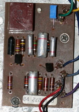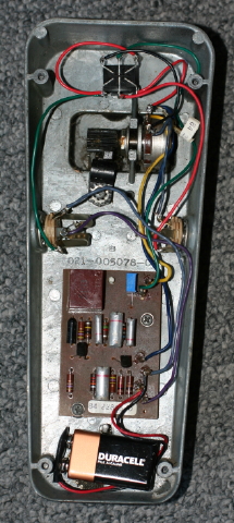 Notice the trim pot for the "Q" resistor and the replacement Xicon carbon composition resistors (can you spot them?). The resistors I replaced had drifted by nearly 20%, which I decided was beyond acceptable. The caps are all original, as are the transistors and the pot. The switch is a replacement DPDT, which allows for true bypass. When I got this pedal the switch was broken (which explains the $10 price tag).